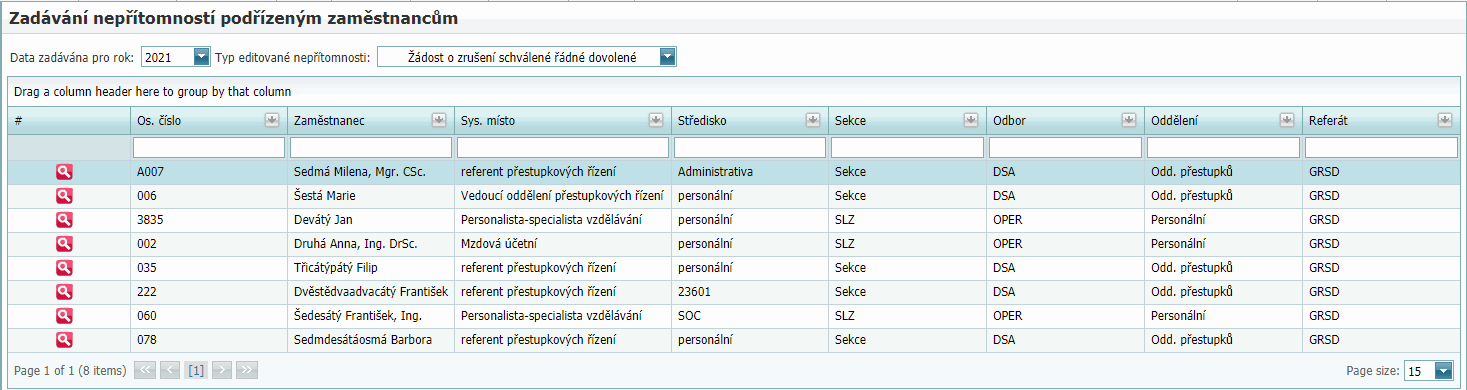 Schvalovateli se zobrazí seznam podřízených zaměstnanců z hlediska stromu ORS a také zaměstnanci z organizačních členění, kterých je pověřen řízením.