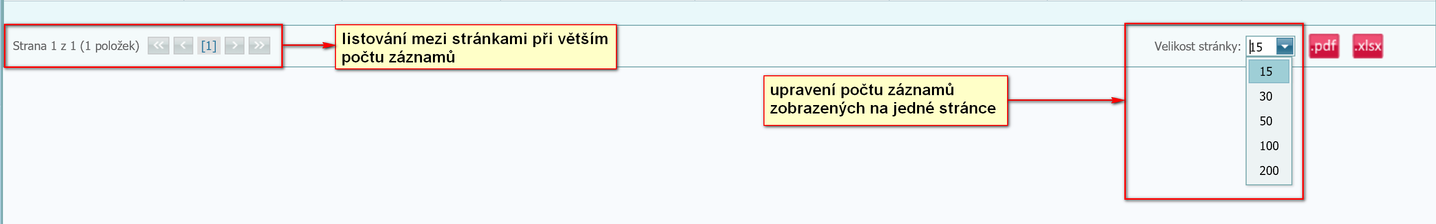 Ve spodní části stránky lze listovat mezi stránkami a upravovat počet záznamů na stránku.
