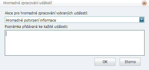 Vyberte si požadovanou akci. Jestliže napíšete poznámku, bude dodána do každé zpracované wf události. Jestliže bude označena řádka, která nebude vybrané hromadné akci vyhovovat, nic se neprovede.